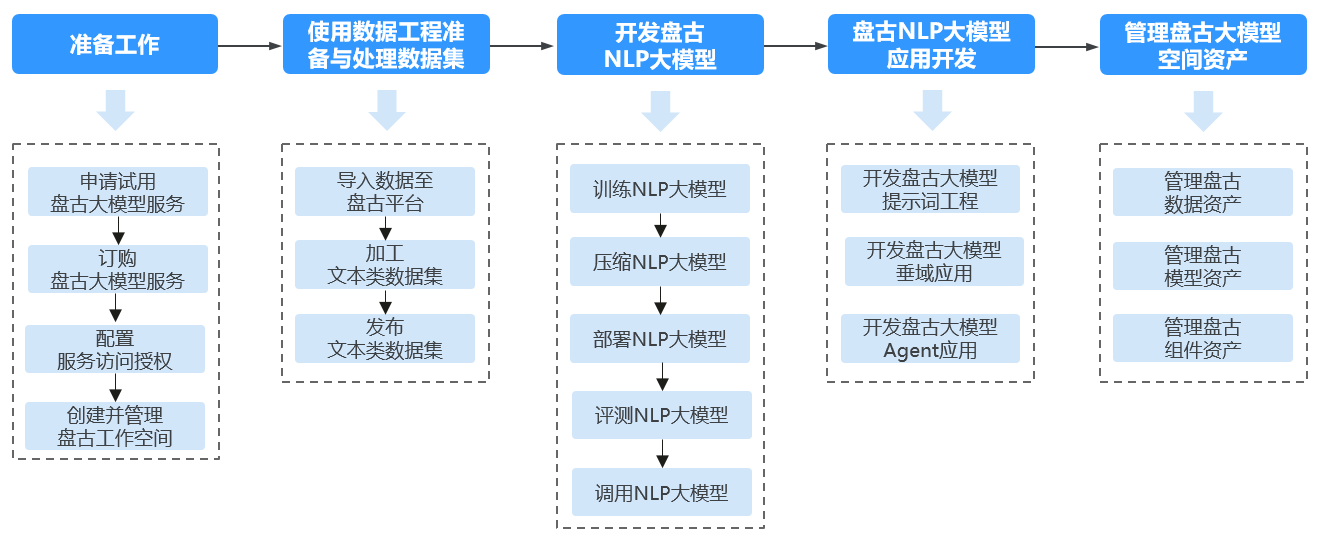 ModelArts Studio大模型开发平台提供了NLP大模型的全流程开发支持,涵盖了从数据处理到模型训练、压缩、部署、评测、调用的各个环节。
