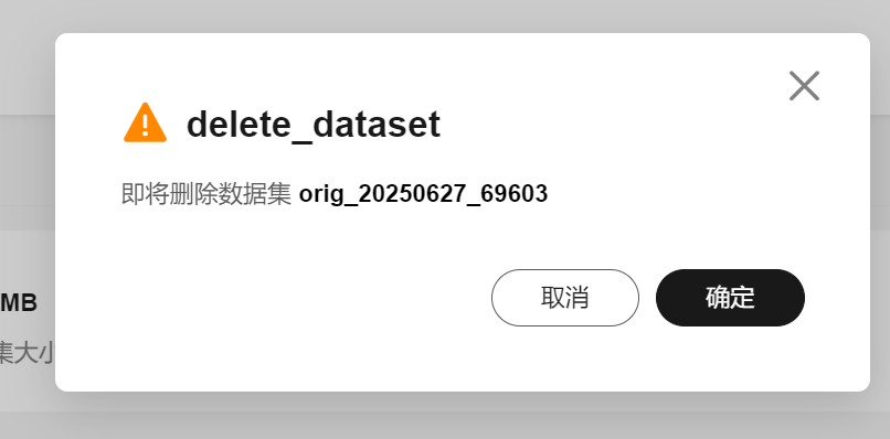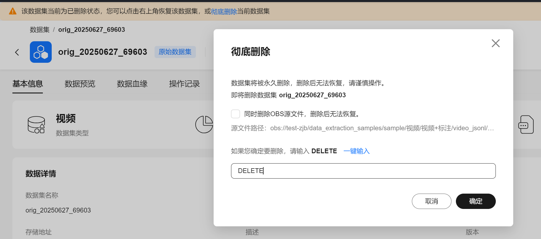 图8 彻底删除删除“原始数据集”属于高危操作,删除前,请确保该数据集不再使用。