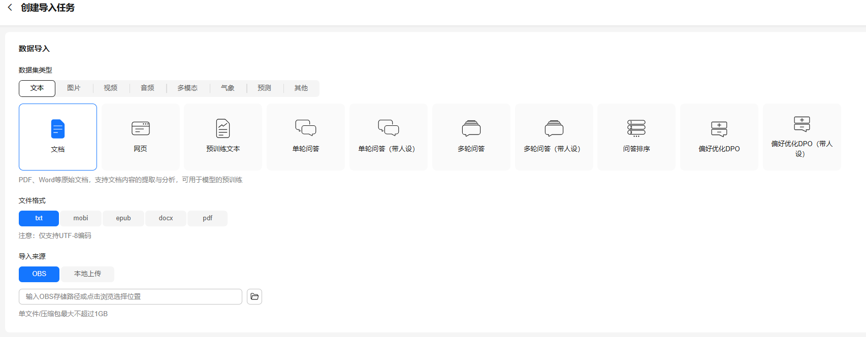 - 在“创建导入任务”页面,选择“数据集类型”、“文件格式”和“导入来源”。
