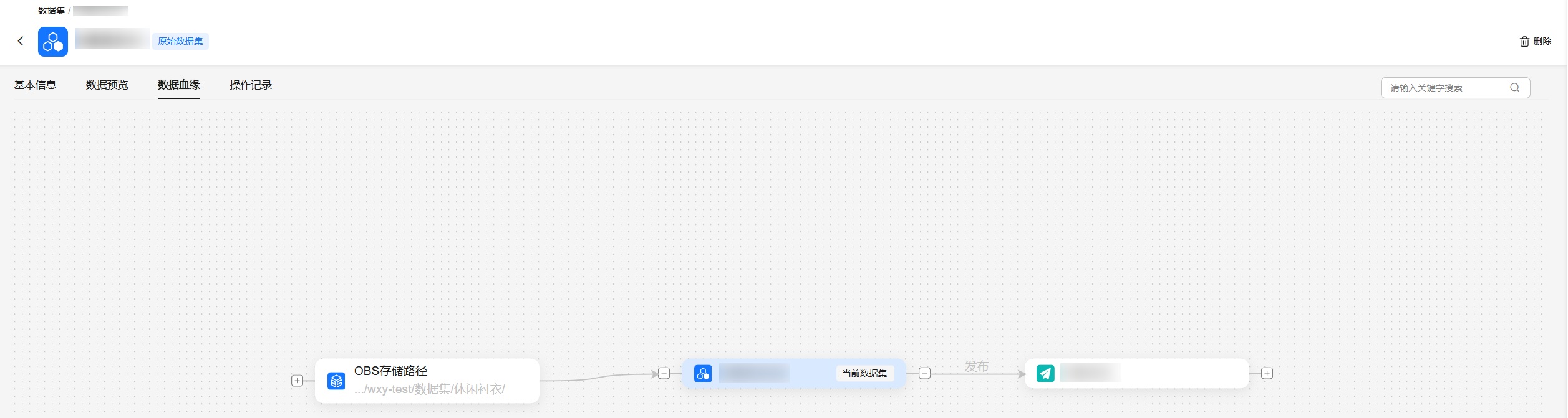 - 查看数据血缘。在“数据血缘”页签,可以查看当前数据集所经历的完整操作,如加工、标注等。数据血缘上钻至OBS源文件下钻至模型训练。