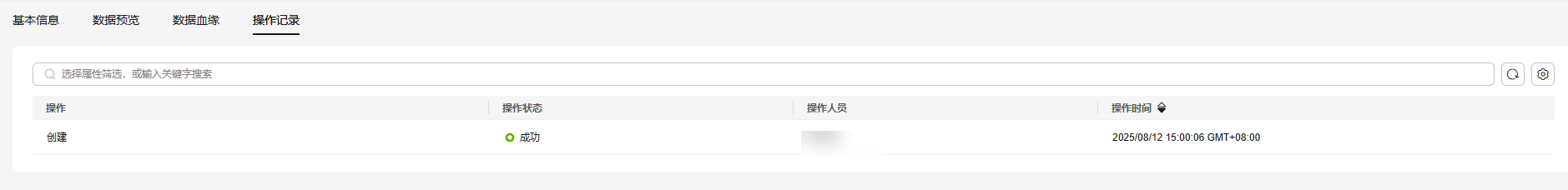 - 查看操作记录。在“操作记录”页签,可以查看当前数据集的操作记录,如创建该数据集的时间、状态、操作人员等。