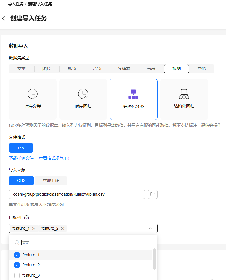 - 在导入任务中选择“预测 > 时序分类”或“预测 > 结构化分类”。
