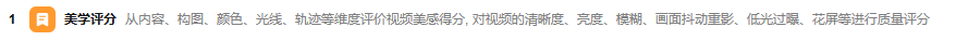 从内容(吸引人,清晰度)、构图(目标物位置良好)、颜色(有活力,令人愉悦)、光线(光线明显有对比度)、轨迹(连续、稳定)等维度评价视频美感得分。分值范围(0, 1),数值越高美感越好,评分>0.95可视为视频基础质量较高的视频。 |
