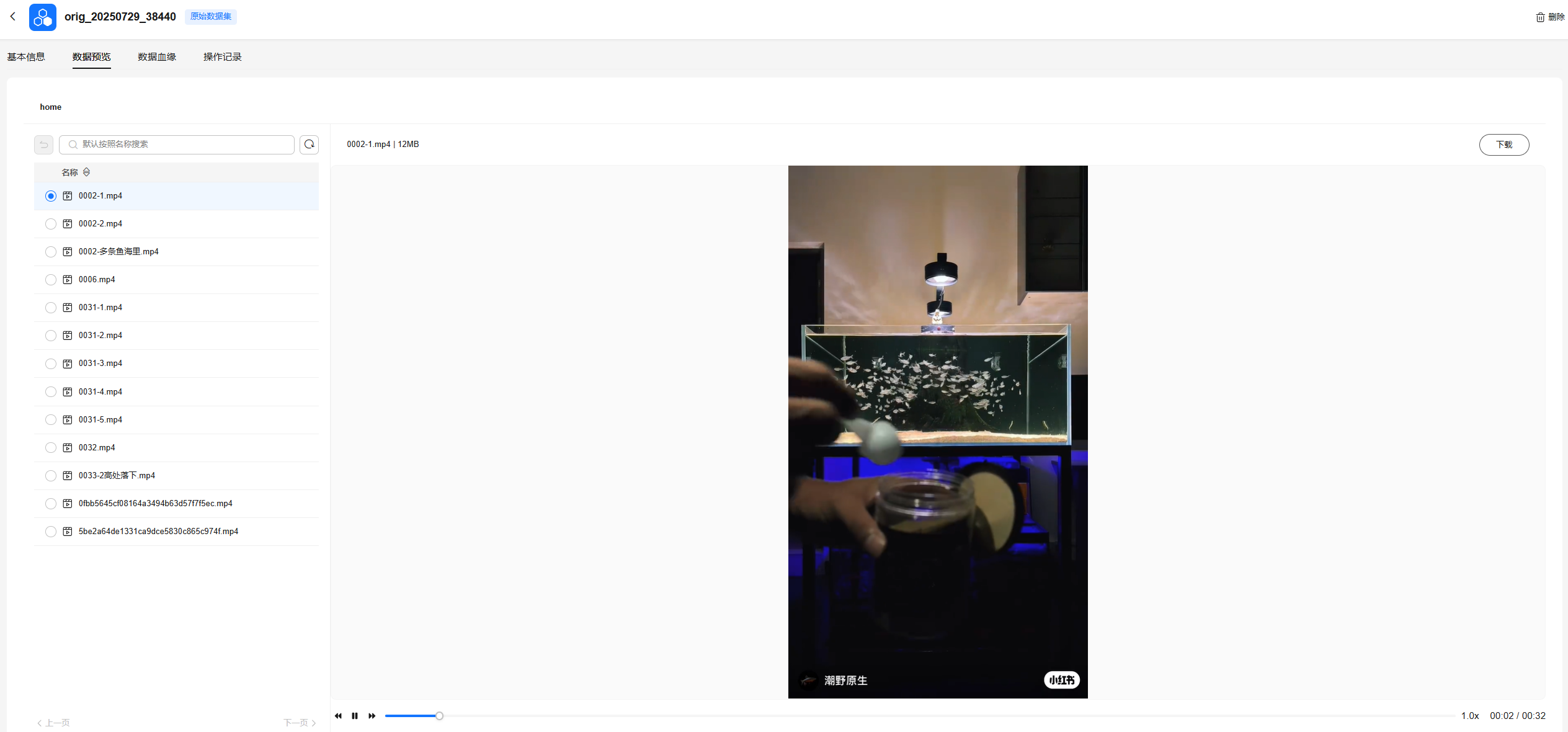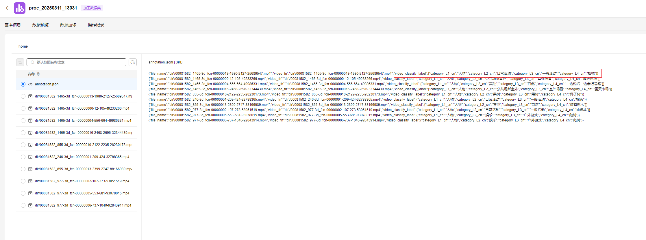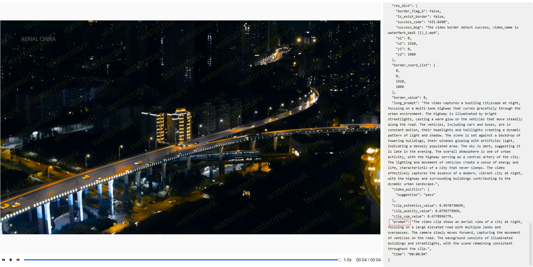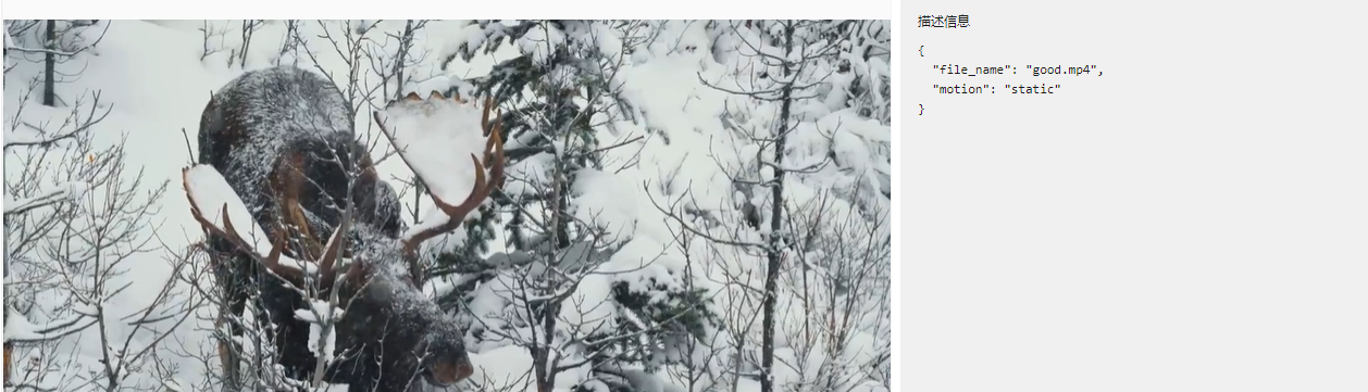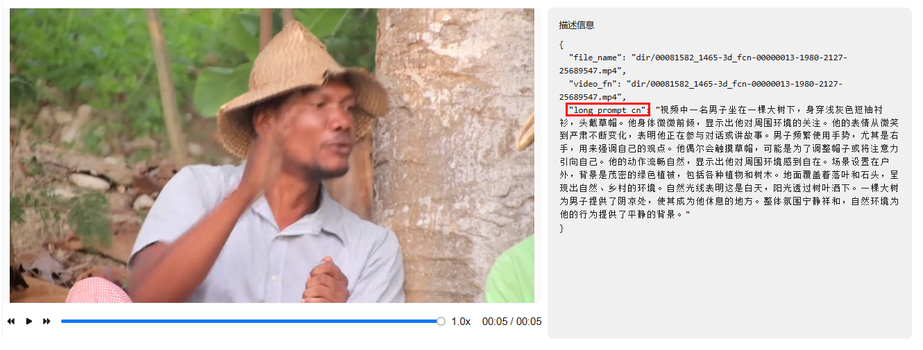 - 打标样例:描述信息中prompt字段代表简略的视频摘要。