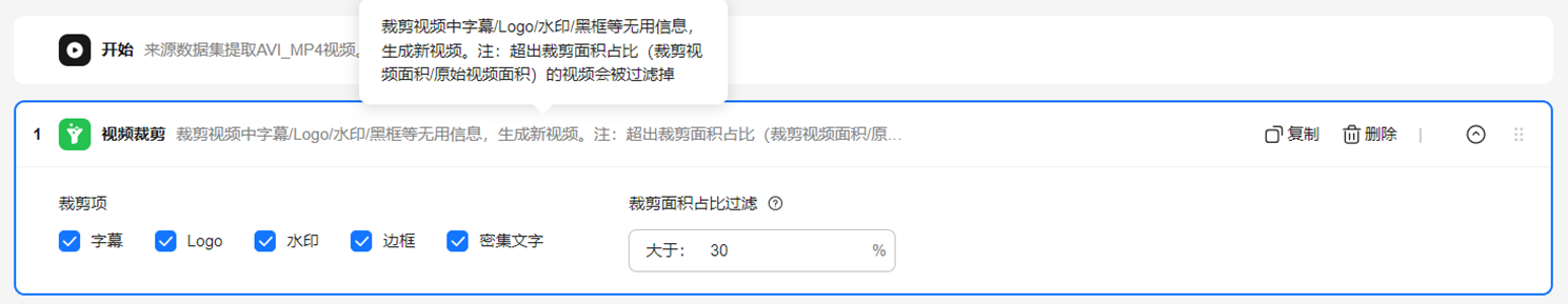 视频裁剪是裁剪掉视频中不必要的元素,比如字幕、Logo、水印、边框和密集文字,同时过滤掉那些裁剪后面积比例超出预设阈值的视频文件;使用前需要先执行字幕、logo、水印、边框、密集文字识别算子。 |