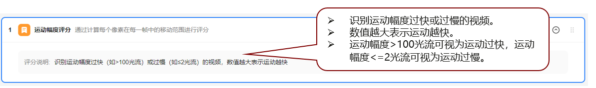 通过计算每个像素在每一帧中的移动范围进行评分,识别运动幅度过快(如>100光流)或过慢(如≤2光流)的视频,数值越大表示运动越快。 |