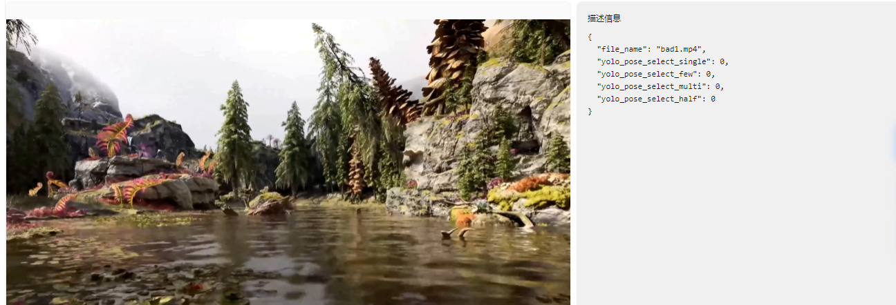 通过对视频抽8帧,模型分别对图片进行标记关键点,输出任务bbox框和关键点坐标,通过对坐标的计算判断视频中是否存在人物。 |