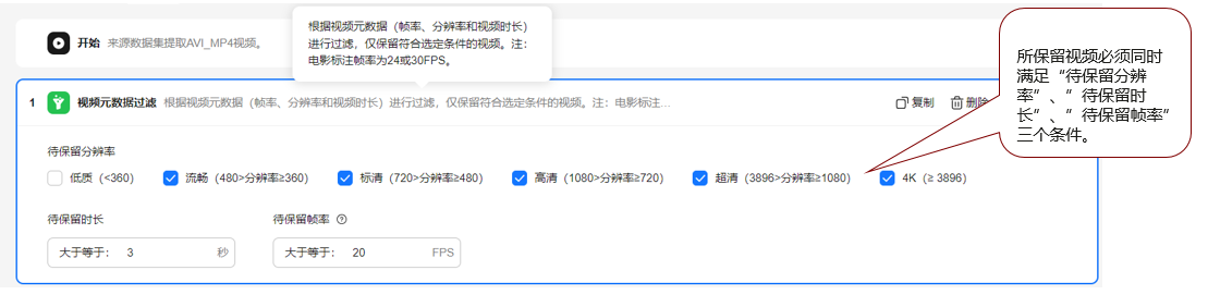根据视频元数据(帧率、分辨率和视频时长)进行过滤,仅保留符合选定条件的视频。注:电影标准帧率为24或30FPS。 |