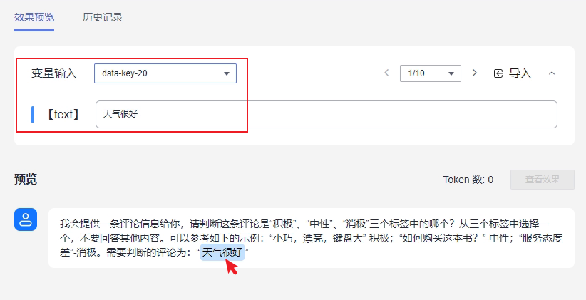 提示词撰写完成后,可以通过输入具体的变量值,组成完整的提示词,查看不同提示词在模型中的使用效果。