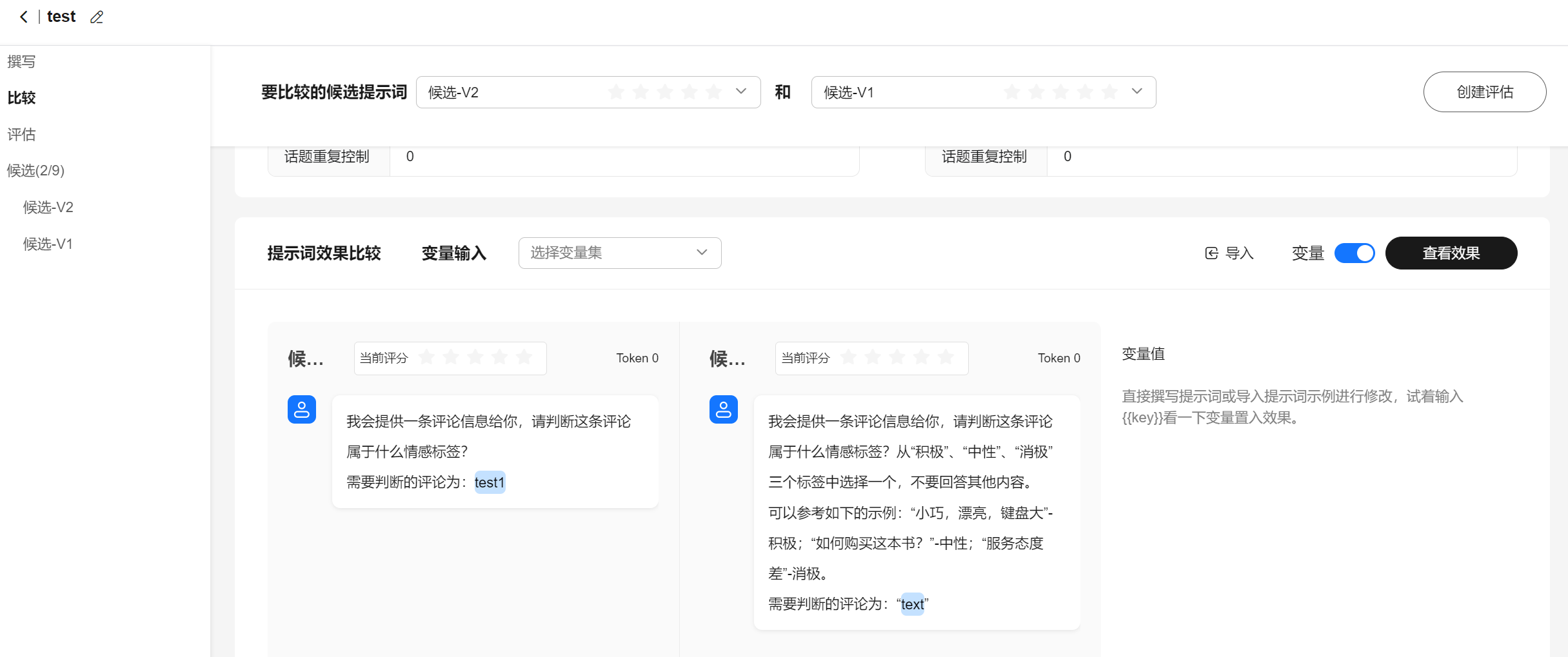 - 进入到横向比较页面,下拉页面至“提示词效果比较”模块,比较提示词的效果,输入相同的变量值,查看两个提示词生成的结果。