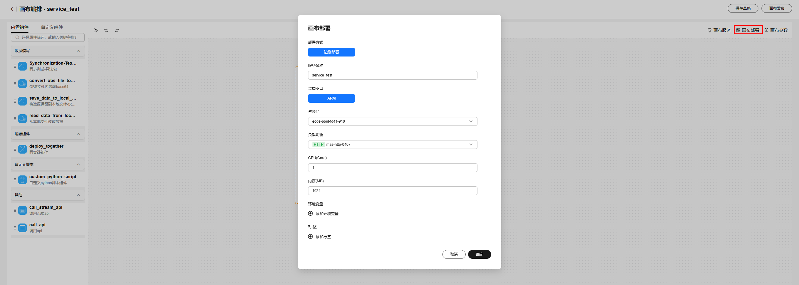 - 部署完成后,单击画布右上角“画布服务”按钮,进入画布服务列表页面。