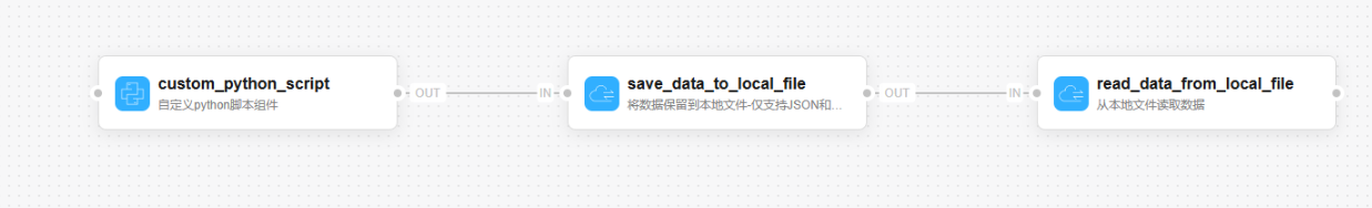 - 依次在画布中拖入custom_python_script,save_data_to_local_file,read_data_from_local_file组件,并按照下图进行配置连接。