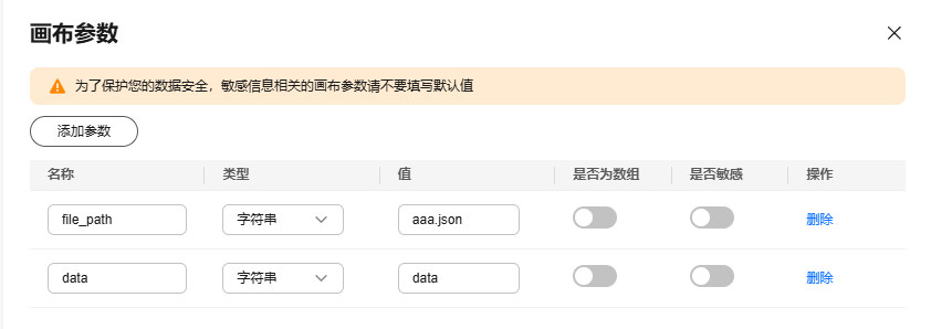- 单击画布右上角“画布参数”,参考下图配置画布参数file_path、data。