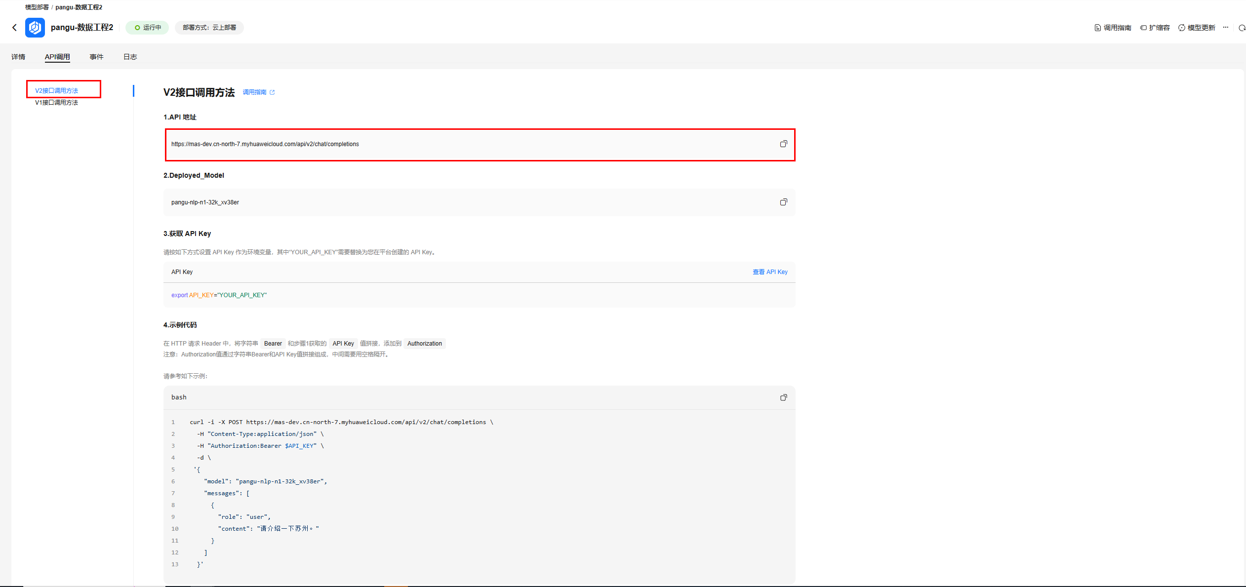 预置模型或训练后的模型部署成功后,可以使用“文本对话”API实现模型调用。NLP推理服务支持使用盘古推理接口(V1推理接口)调用,也支持使用业界通用的OpenAi格式接口(V2推理接口)调用。V1接口、V2接口的鉴权方式不同,请求体和返回体略有差异。