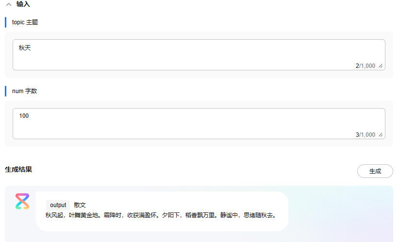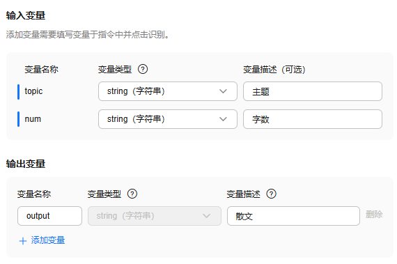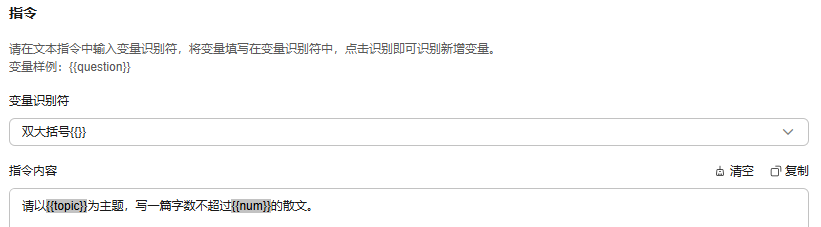 - 选择变量标识符为“双大括号{{}}”,输入指令为“请以{{topic}}为主题,写一篇字数不超过{{num}}的散文。”