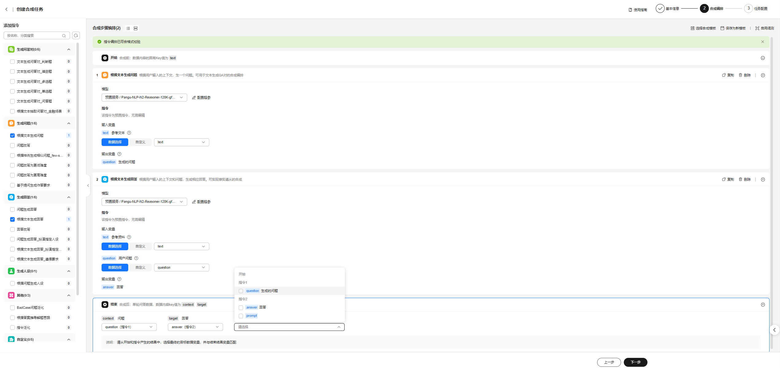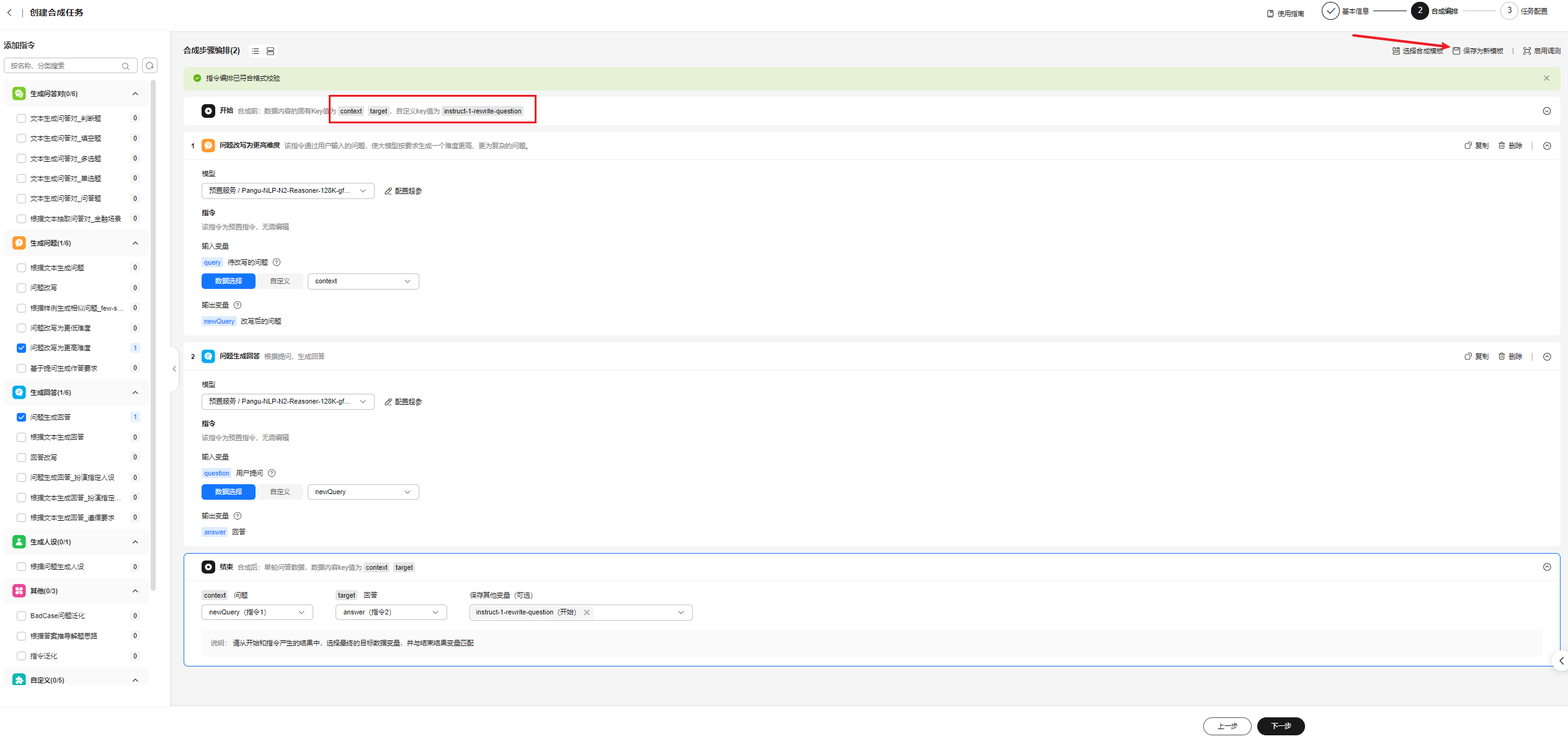 - 进入“合成编排”页面,如图3所示页面开始栏会显示当前数据集数据类型对应的固定字段和除固定字段以外,数据集内其它的自定义字段,这些字段可以在指令输入输出变量中选中。在左侧“添加指令”页面可选择预置指令或自定义指令,指令编排需要按逻辑编排,若同时选择三个生成问答对类型的指令,最终输出结果也只会保存一条问答对数据。