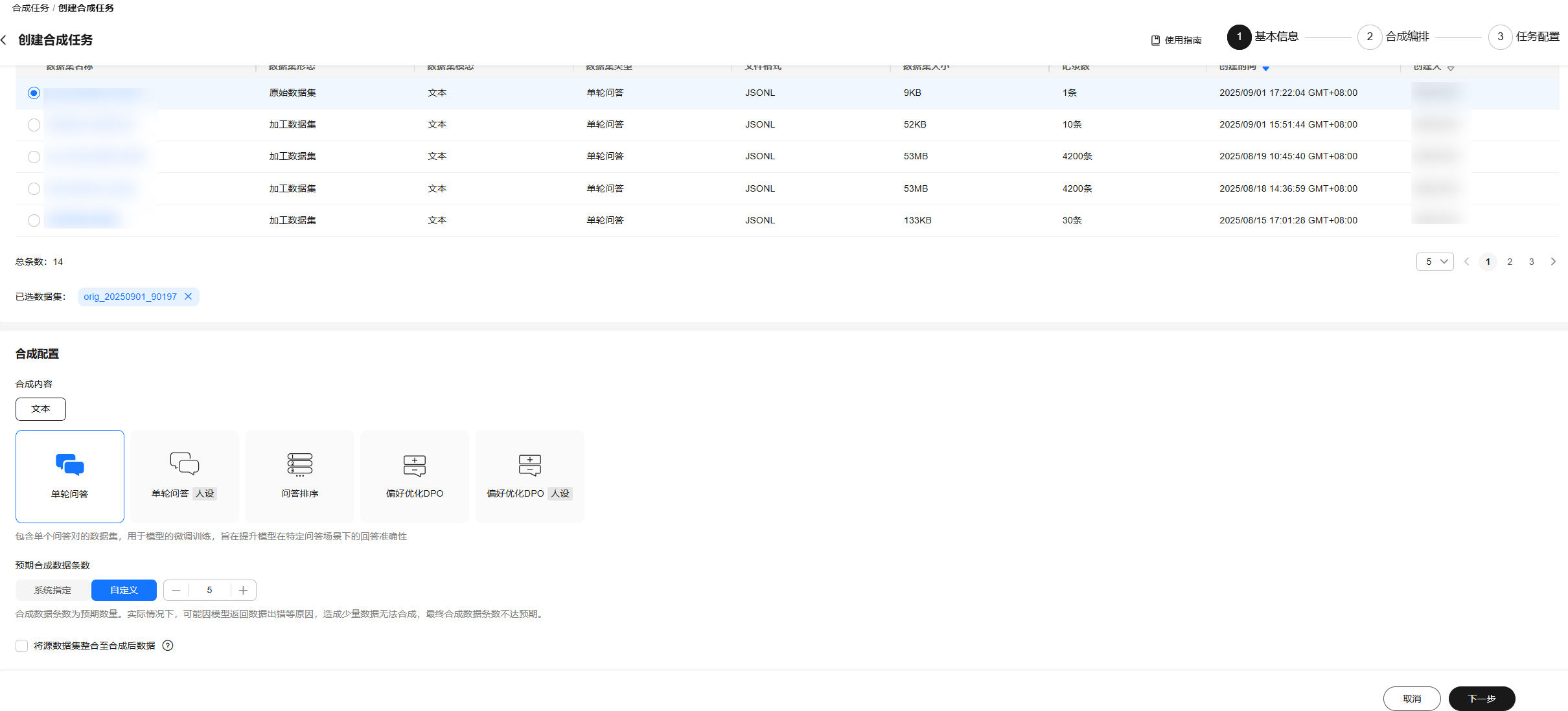 - 在“创建合成任务”页面,选择需要合成的数据集,选择合成内容与预期合成条数,如图2,系统指定预期合成条数则为数据集初始数据条数。
