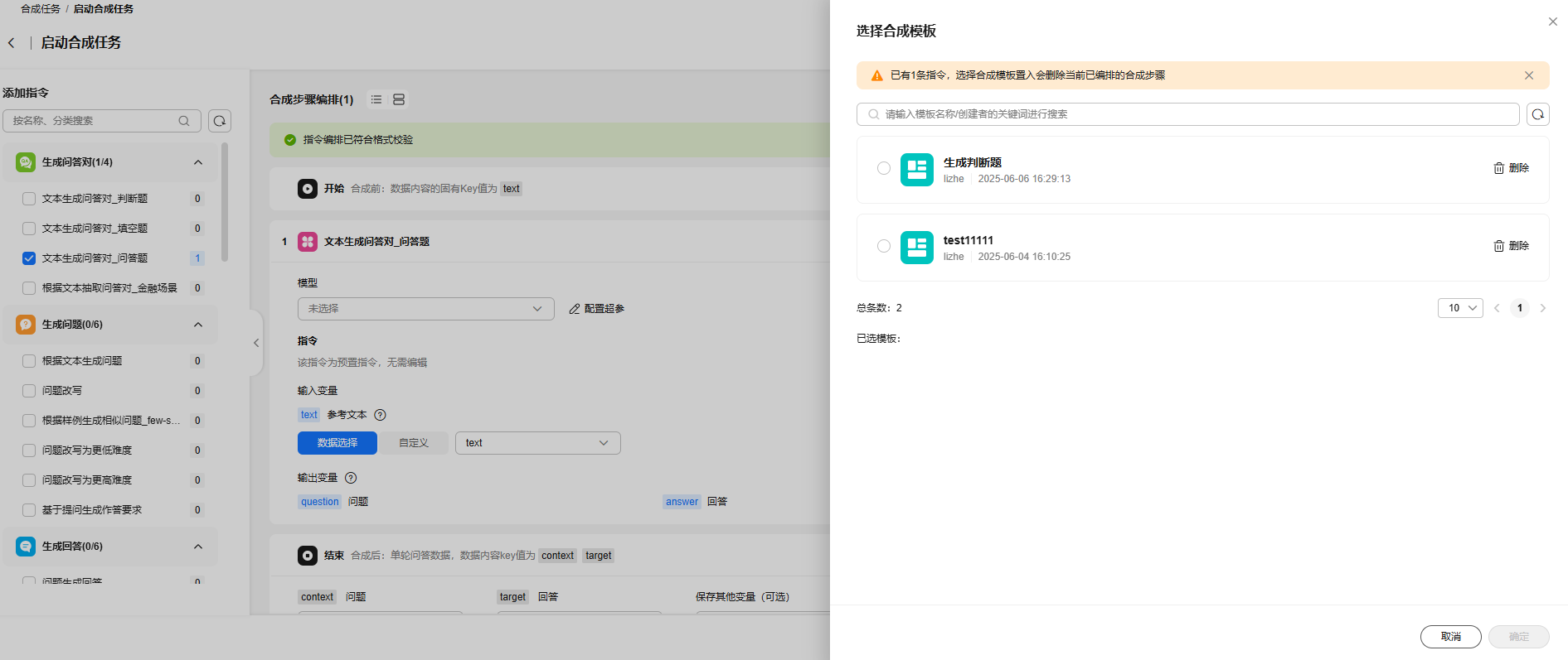 - 编排完成的指令,可单击"创建合成模板",保存当前的指令编排内容供下次一键复用,在右侧可通过单击“选择合成模板”选择一个模板编排,如图4所示,模板只有输入类型和输出类型相同的情况下才可见,如:输入为预训练文本,输出为单轮问答,若当前输入数据类型(如:单轮问答)与保存模板时的输入类型(如:预训练)不一致,当前数据选择合成模板时将不可见该模板。