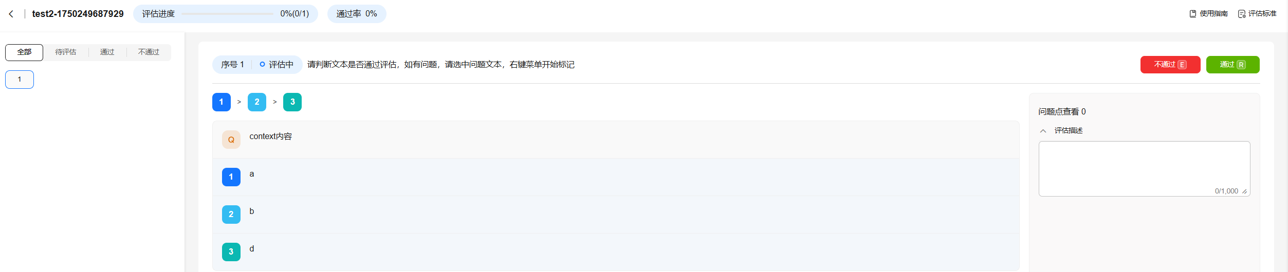 - 在评估页面,可参考评估项对当前数据的问题进行标注,且满足则单击“通过”,不满足则单击“不通过”。