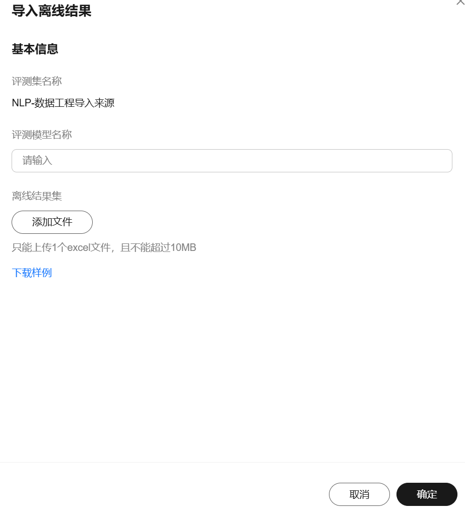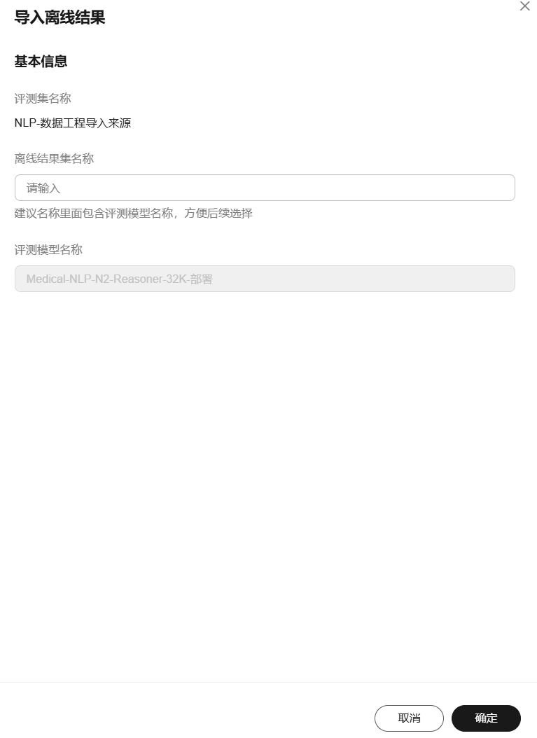 在自定义评测集列表的中选择任意评测集,单击“更多 > 导入离线任务”,弹出“导入离线结果”对话框,如图图12。