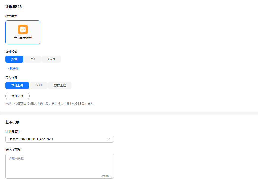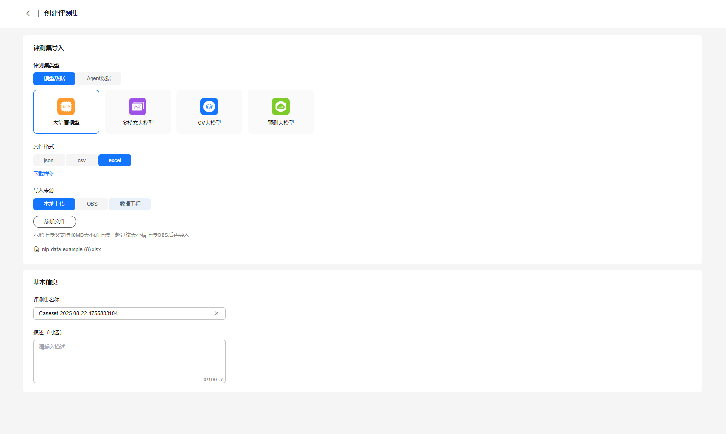评测集支持从本地上传、OBS文件和数据工程数据集导入
