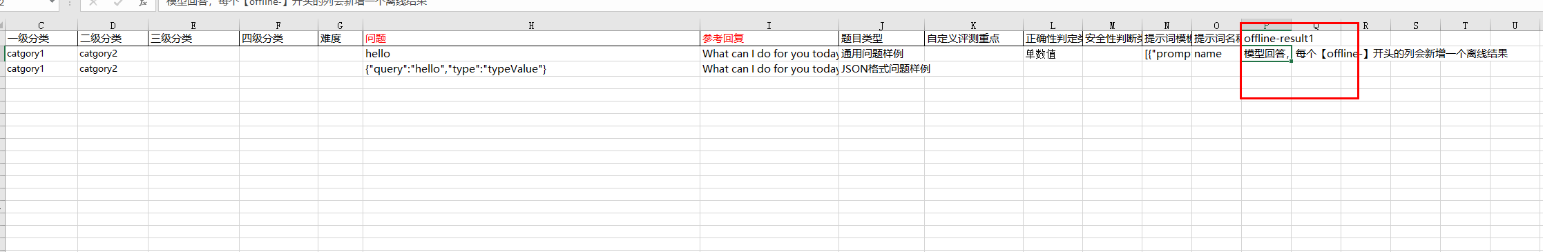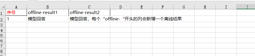 - 上传excel格式的离线结果文件,离线结果文件填写规则可以参考样例文件,如图14 excel格式模板。离线结果excel的序号列需要和评测集用例的序号对应,以便把离线结果的模型回答关联到评测集用例,offline-”开头的列的列名表示离线结果名称,值表示每个用例的模型回答。可以新增最多不超过10个“offline-”开头的列,一次绑定多个离线结果。