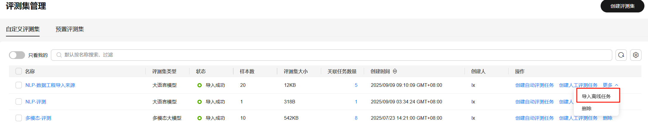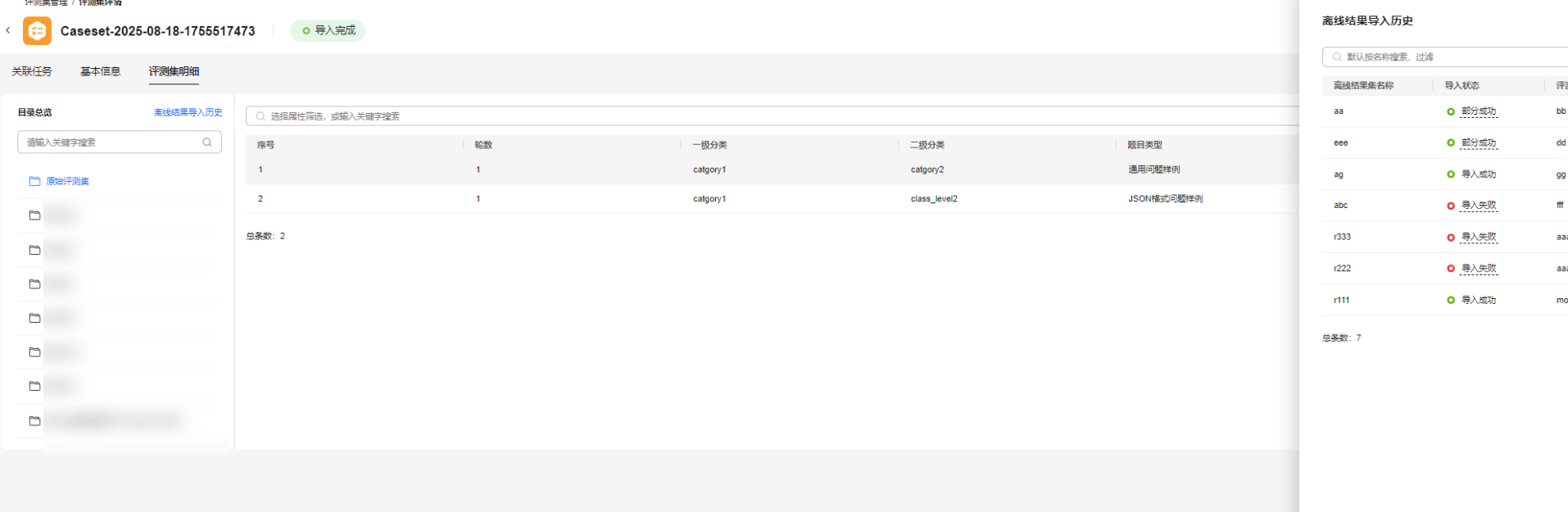 可以在评测集详情页面中查看离线结果导入历史任务,以及导入的数据,具体如下: