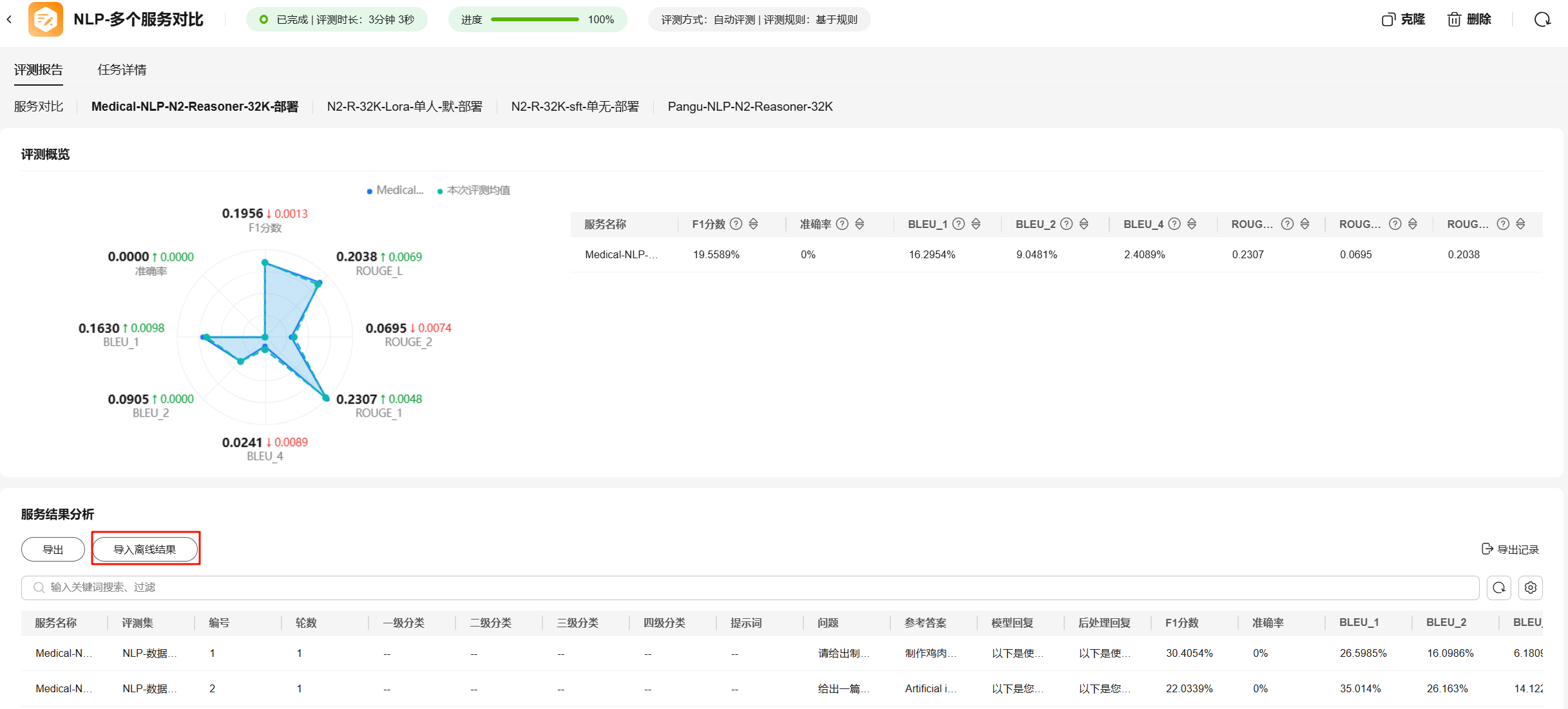 - 在“评测概览”下方的“服务结果分析”栏目,选择“导入离线结果”。