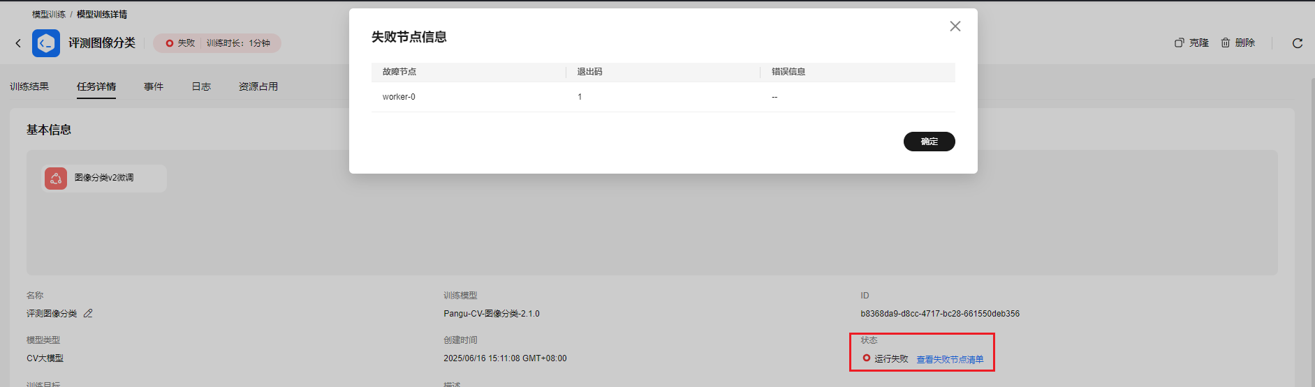 - 当训练任务运行失败时,可查看“模型训练详情 -> 基本信息 -> 状态”,单击“查看失败节点清单”获取训练任务故障节点及退出码信息。
