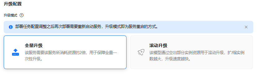 - 全量升级:新旧版本服务同时运行,直至新版本完全替代旧版本。在新版本部署完成前,旧版本仍可使用。需要该服务所消耗资源的2倍,用于保障全量一次性升级。