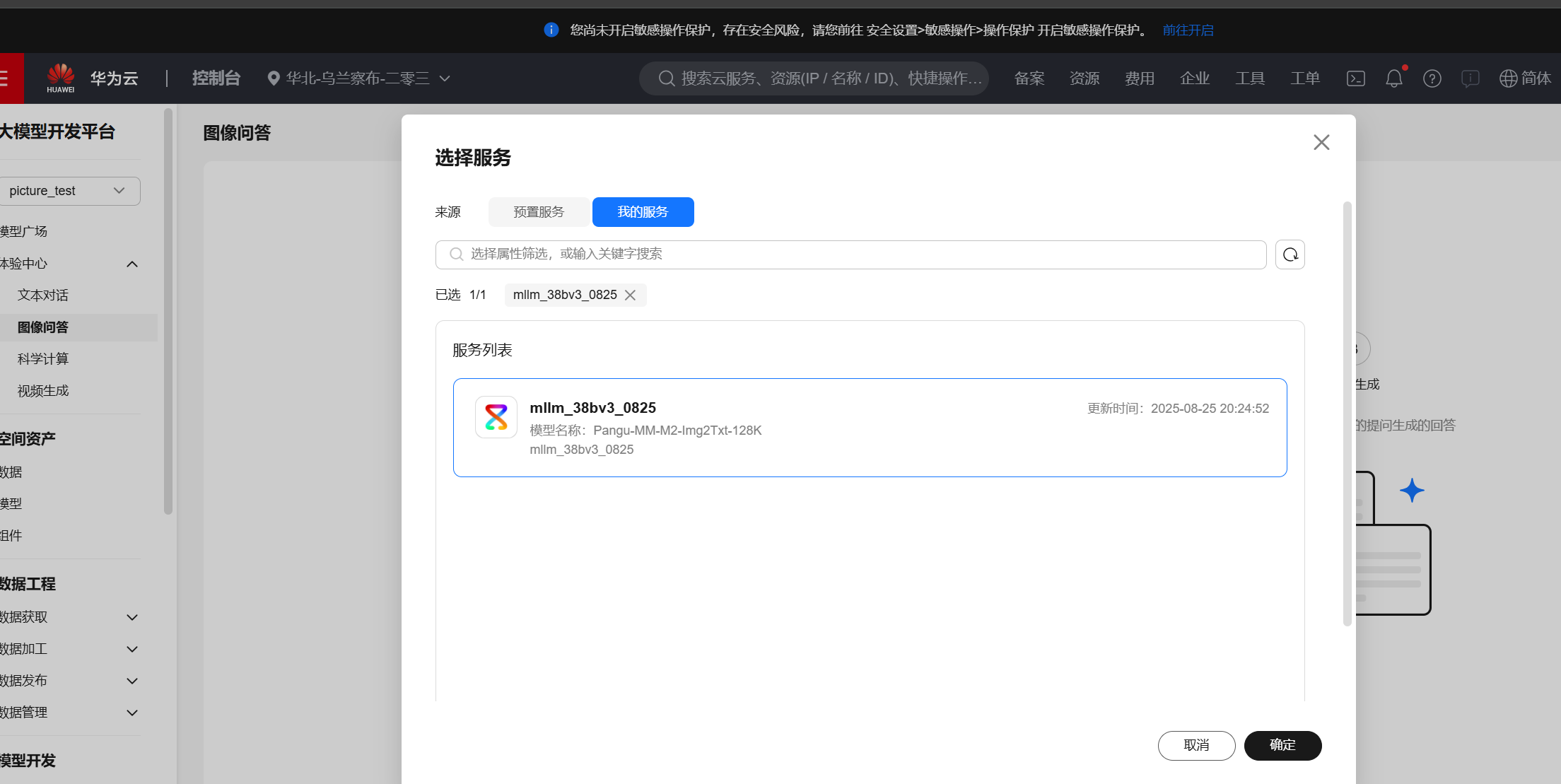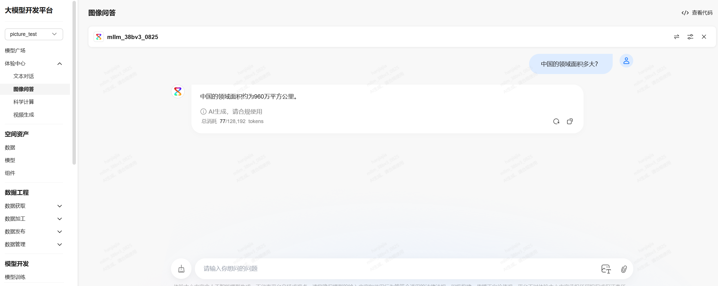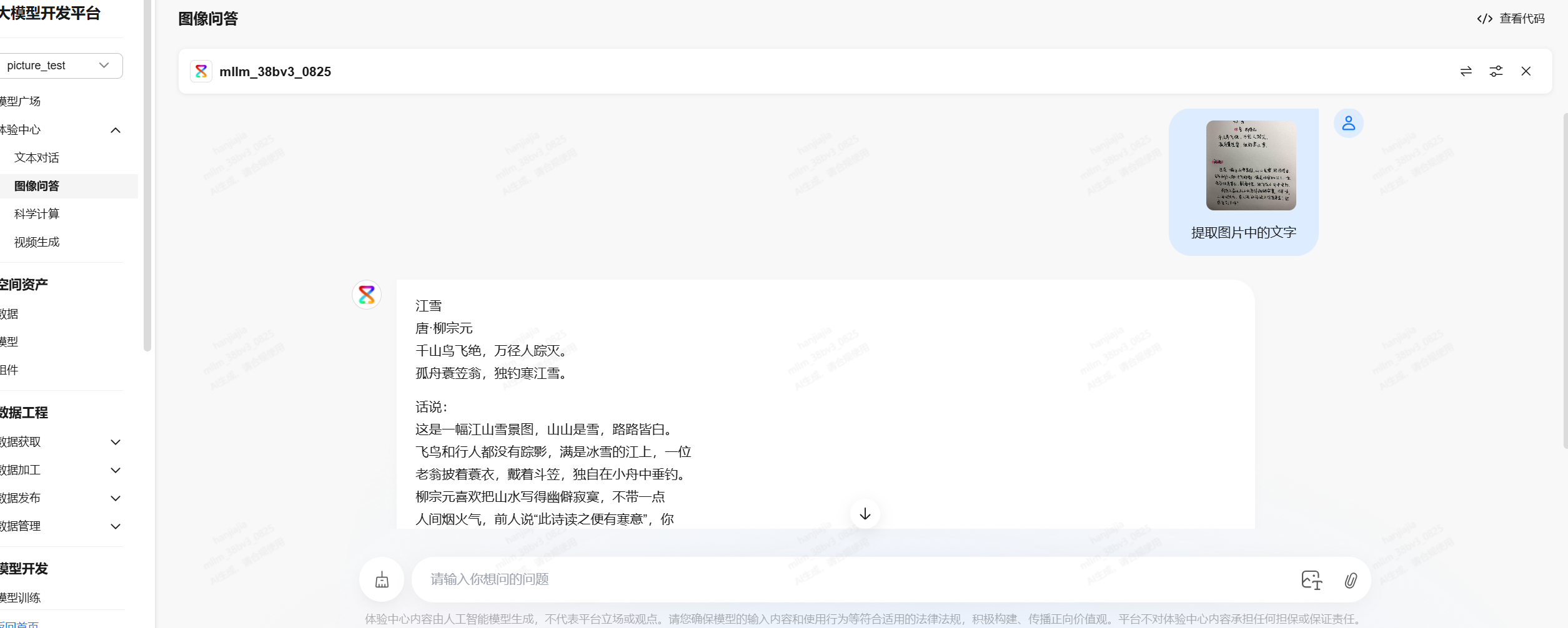 “体验中心”功能支持用户直接调用订购的预置模型,或经过训练的模型。在体验模型功能前请先完成创建多模态大模型部署任务操作。