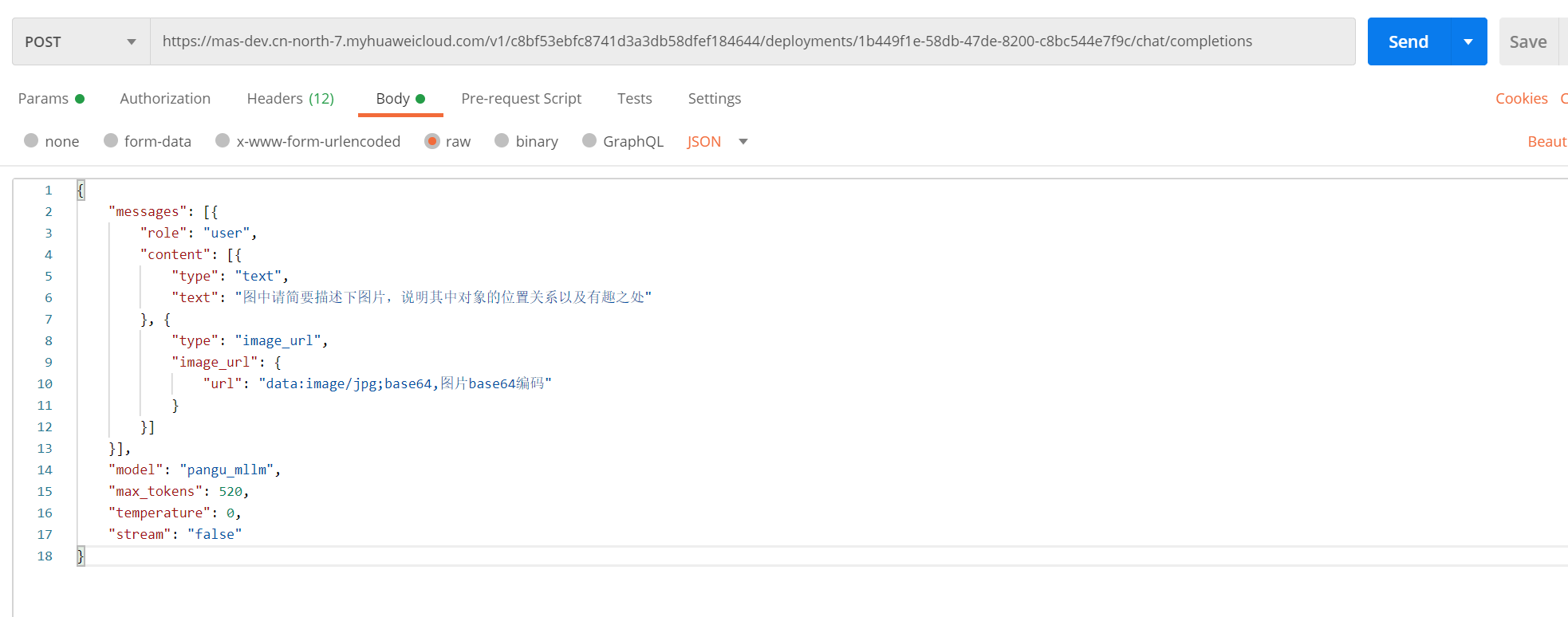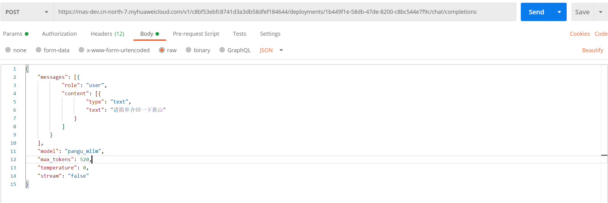 { "messages": [{ "role": "user", "content": [{ "type": "text", "text": "请简单介绍一下黄山" }, ] } ], "model": "pangu_mllm", "max_tokens": 520, "temperature": 0, "stream": "false", }图4 填写多模态大模型请求Body(单图)