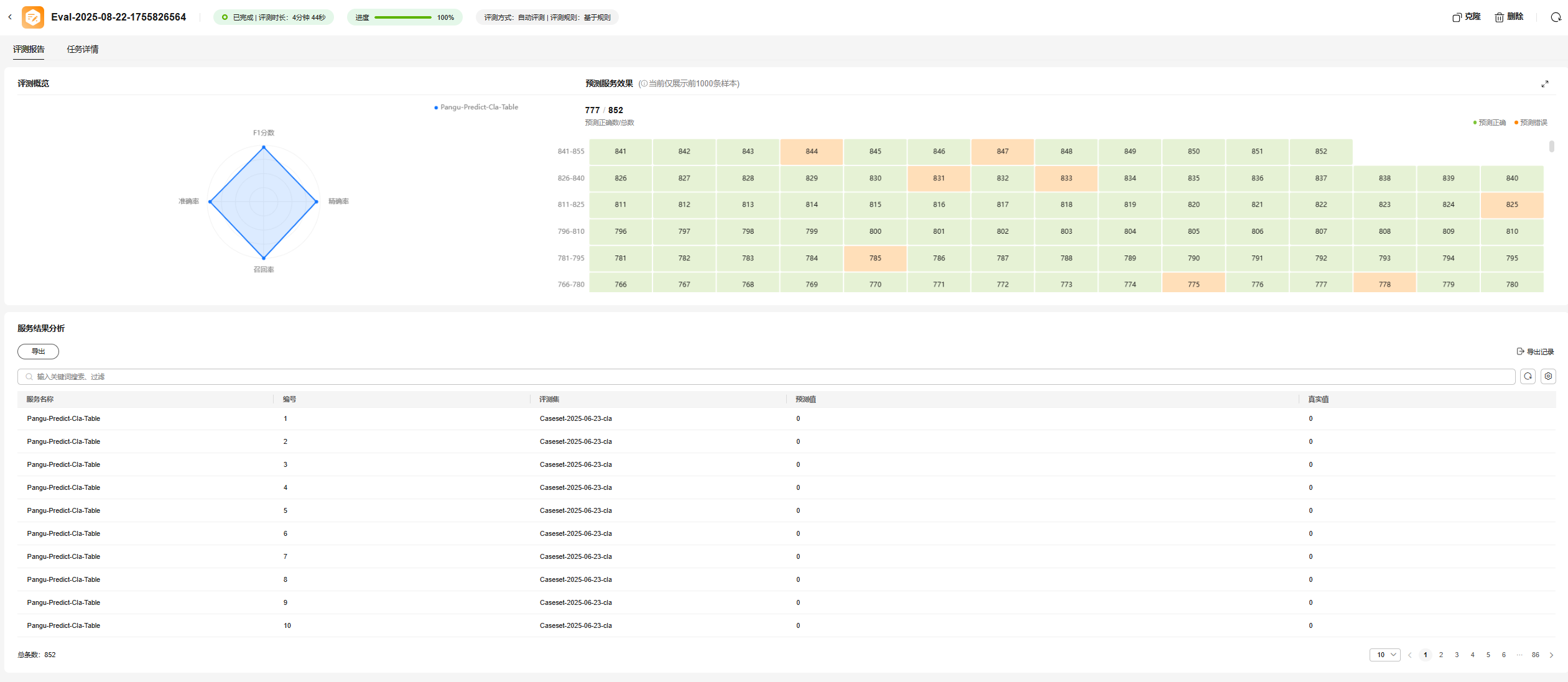 - 返回“评测任务 > 自动评测”页面,可查看创建好的评测任务,此时任务状态显示为“初始化”,等到自动评测完成,状态显示为“已完成”时,可以单击操作列“评测报告”查看模型评测结果。在“评测报告”页面可以查看详细的得分以及评测数据信息。