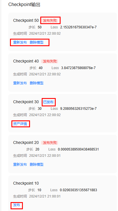单击CKPT产物信息下方的“发布”即可进行资产发布,发布成功时,状态为“已发布”,单击资产详情可查看具体资产信息;发布失败时,状态为“发布失败”,支持“重新发布”和“删除模型”操作。