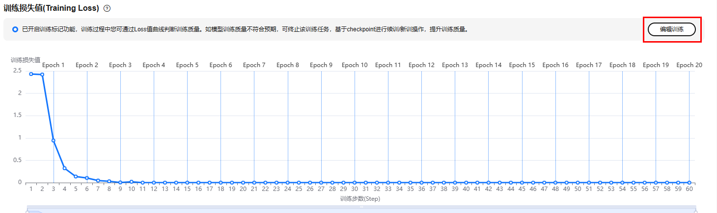 如果三方模型支持断点续训和Checkpoint模型发布,三方模型进行微调后,单击三方模型训练任务名称,并进入“训练结果”页面,在“训练损失值”中单击“编辑训练”,在Checkpoint输出中即可看到CKPT产物信息。