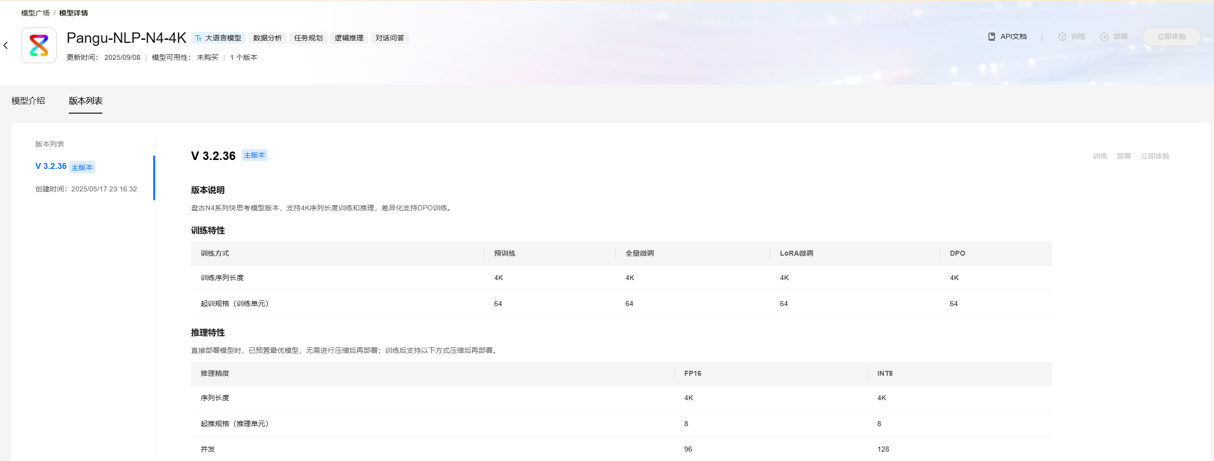 模型详情界面展示信息分为模型介绍以及版本列表页。模型介绍页主要展示对应模型的介绍内容、模型使用申明、平台服务协议。版本列表页展示当前模型下多个版本的特性介绍。