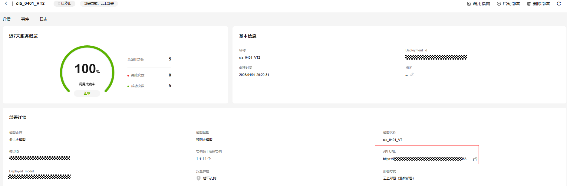 - 在左侧导航栏中选择“模型开发 > 模型部署”,单击“模型名称”在“详情”页面获取API请求地址。
