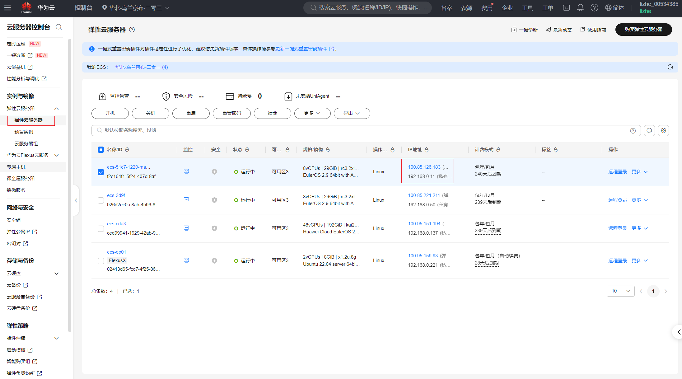 图4 在弹性云服务器界面下,寻找到私有ip对应的弹性ip,如192.168.0.11->100.85.126.183