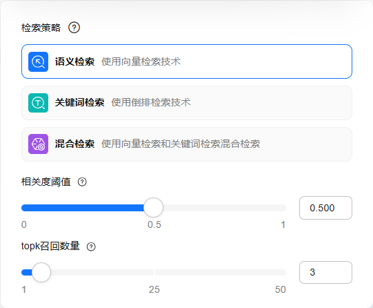 - 混合检索:使用向量检索和关键词检索两种策略混合检索知识库,推荐在需要兼顾用户意图理解及关键词匹配度场景中使用。
