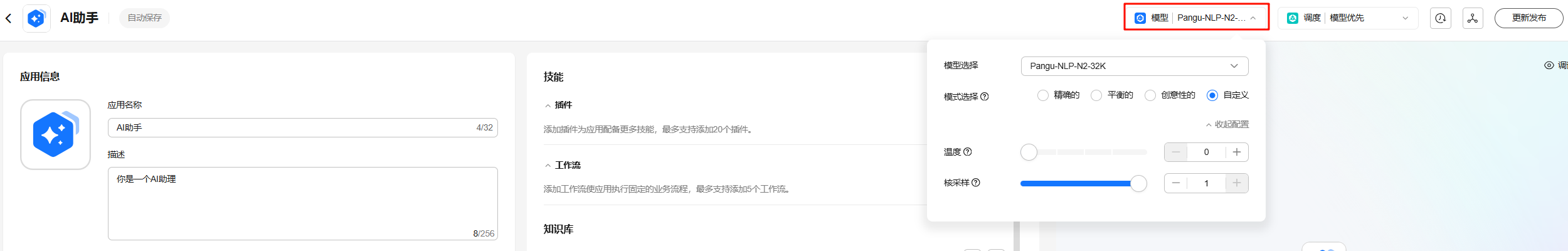 - 自定义:自定义大模型输出的温度和核采样值,生成符合预期的输出。