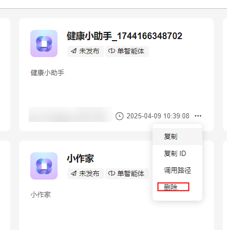 - 在单智能体应用列表中,选择待删除的应用,单击应用的右下部分展开功能列表,选择删除。