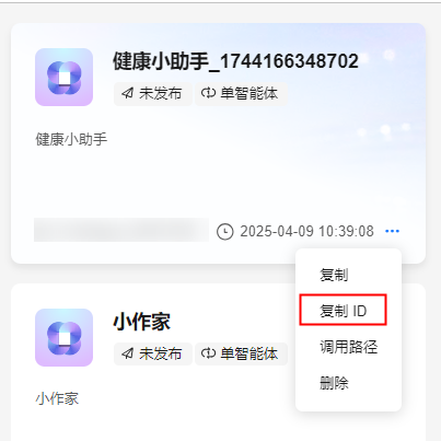 在Agent平台中创建应用之后,可以管理工作台中的应用,例如删除或者复制自己创建的应用ID以及查看调用路径。