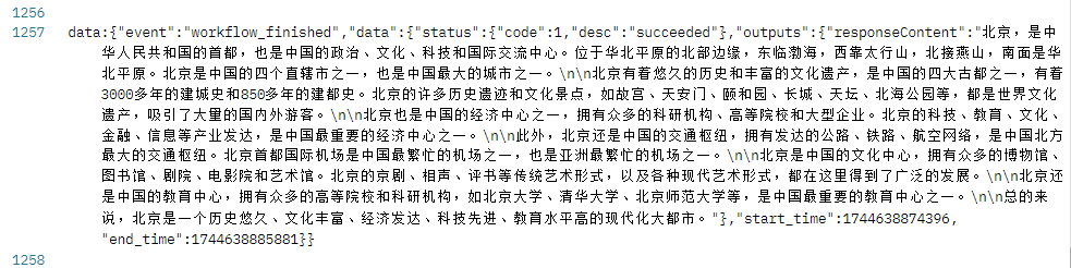 工作流不带提问器节点时的返回示例如下所示,具体参数释义详见API参考。