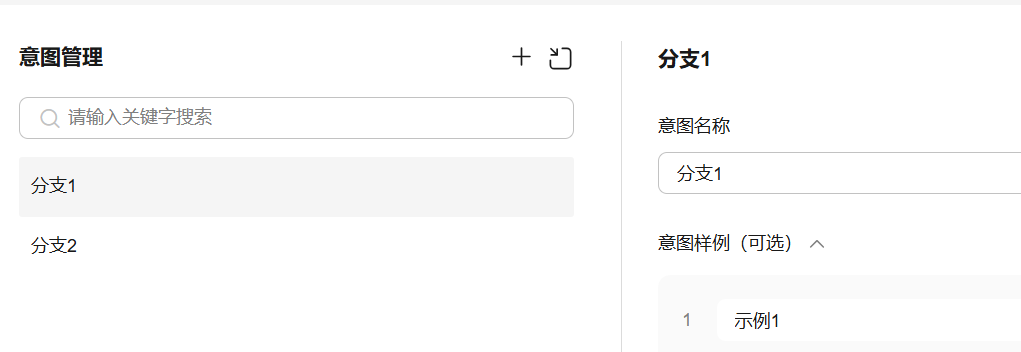 用于配置相关意图关键字信息,用户可以添加意图,意图类别默认为意图1、意图2...,意图数量最多为20个。