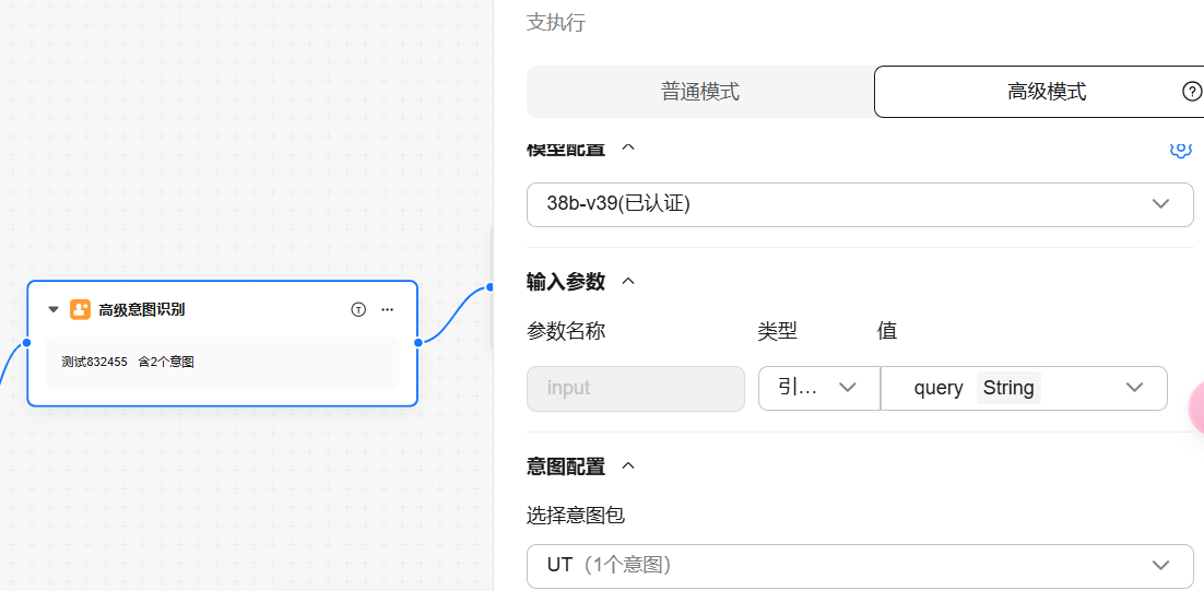 - 拖动左侧“意图识别”节点至画布中,单击该节点以打开节点配置页面。切换为 “高级模式”。