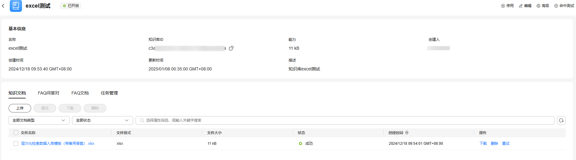 - 单击左侧导航栏“我的工作台”,在“知识库”页签,单击进入知识库详情。