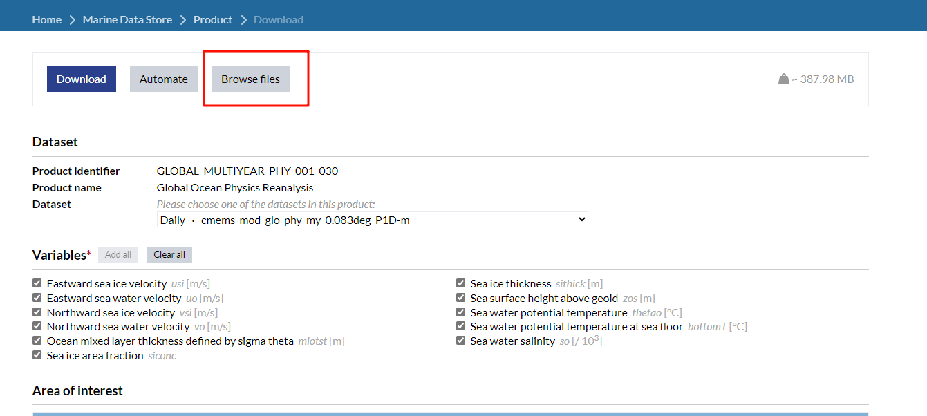 - Variables:选择需要的变量,此处为Eastward sea water velocity,Northward sea water velocity,Sea surface height above geoid,Sea water potential temperature,Sea water salinity。