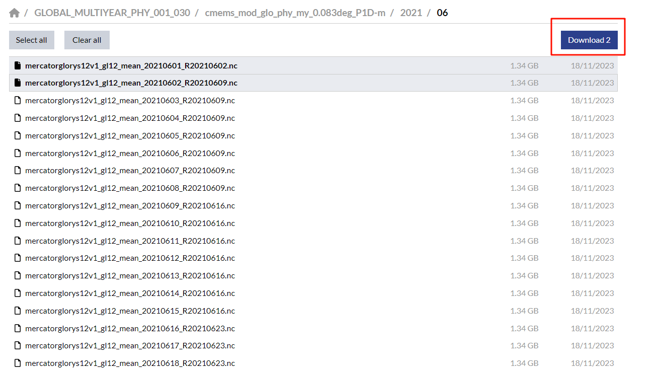 - 方法三:以下载2021年6深海变量数据为例,下载内容为深海变量(海温,海盐,海流经向速率,海流纬向速率,0.49 m→5727.92 m共50层),海表变量(海平面高度),下载步骤示例如下: