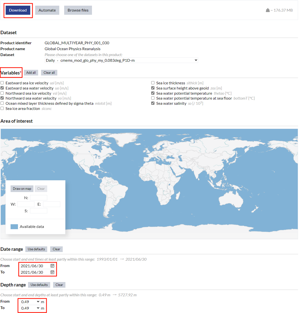 - 方法二:以下载2021年6月30日深海变量数据为例,下载内容为深海变量(海温,海盐,海流经向速率,海流纬向速率,0.49 m),海表变量(海平面高度),下载步骤示例如下: