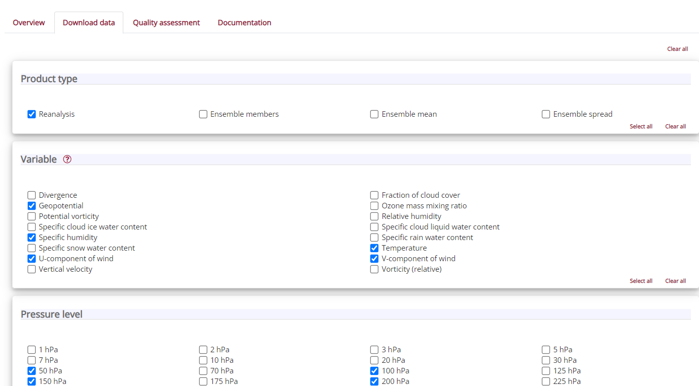 - Pressure level选择1000hPa、925hPa、850hPa、700hPa、600hPa、500hPa、400hPa、300hPa、250hPa、200hPa、150hPa、100hPa、50hPa。
